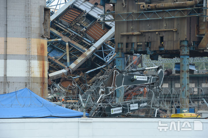 [울산=뉴시스] 배병수 기자 = 울산 남구 용잠동 한국동서발전 울산화력발전소 대형 구조물이 무너지는 사고 발생 나흘째인 9일 오전 소방대원과 관계자들이 매몰자 구조작업을 하고 있다[email protected].