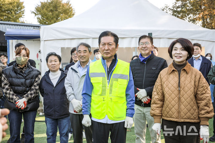 [용인=뉴시스] 정병혁 기자 = 정청래 더불어민주당 대표가 9일 경기 용인시의 유기견 보호소 행복한 강아지들이 사는집을 찾아 봉사활동에 앞서 설명을 듣고 있다. 2025.11.09. [email protected]