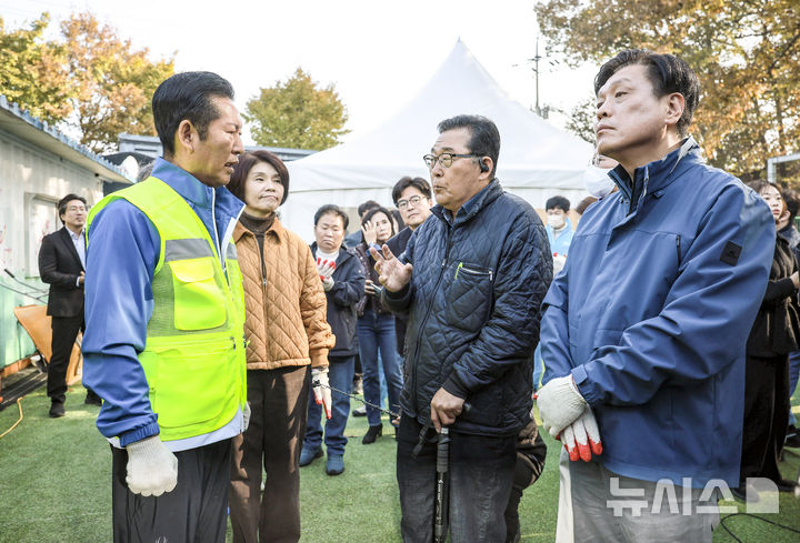 [용인=뉴시스] 정병혁 기자 = 정청래 더불어민주당 대표가 9일 경기 용인시의 유기견 보호소 행복한 강아지들이 사는집을 찾아 봉사활동에 앞서 관계자와 대화를 나누고 있다. 2025.11.09. [email protected]