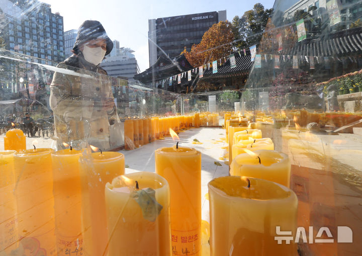 [서울=뉴시스] 배훈식 기자 = 2026학년도 대학수학능력시험을 앞두고 마지막 휴일인 9일 오후 서울 종로구 조계사를 찾은 신도들이 수험생의 고득점을 기원하는 초를 공양하고 있다. 2025.11.09. [email protected]