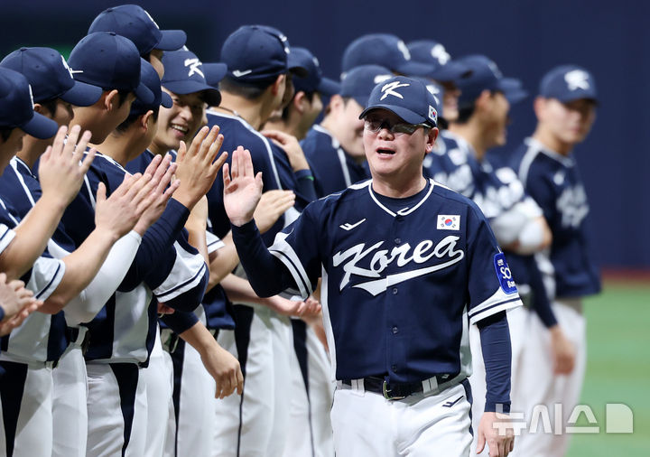 [서울=뉴시스] 조성우 기자 = 9일 오후 서울 구로구 고척스카이돔에서 열린 2025 K-베이스볼 시리즈 대한민국과 체코의 평가전 2차전 경기, 한국 류지현 감독이 식전 행사에 입장하며 선수단과 하이파이브하고 있다. 2025.11.09. [email protected]