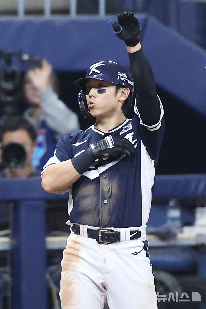 [서울=뉴시스] 조성우 기자 = 9일 오후 서울 구로구 고척스카이돔에서 열린 2025 K-베이스볼 시리즈 대한민국과 체코의 평가전 2차전 경기, 한국 6회초 공격 김성윤이 1타점 2루타를 때린 뒤 3루까지 진루해 세리머니를 하고 있다. 2025.11.09. [email protected]