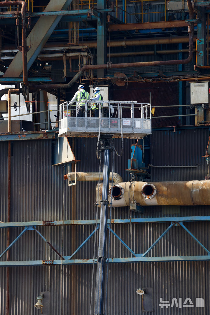 [울산=뉴시스] 배병수 기자 = 9일 오후 울산화력발전소 붕괴 현장에서 매몰자에 대한 구조 및 수색 작업을 잠시 중단한 채 철거 관계자들이 발파 준비를 위한 사전 조치를 하고 있다 [email protected].