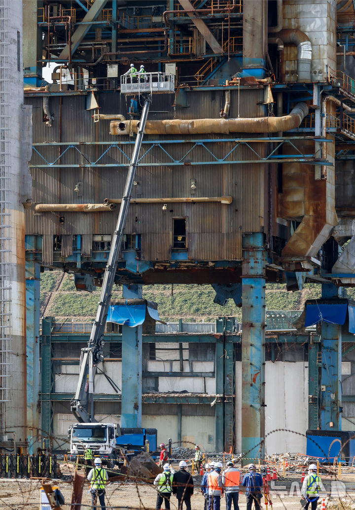 [울산=뉴시스] 배병수 기자 = 9일 오후 울산화력발전소 붕괴 현장에서 매몰자에 대한 구조 및 수색 작업을 잠시 중단한 채 철거 관계자들이 발파 준비를 위한 사전 조치를 하고 있다 [email protected]..