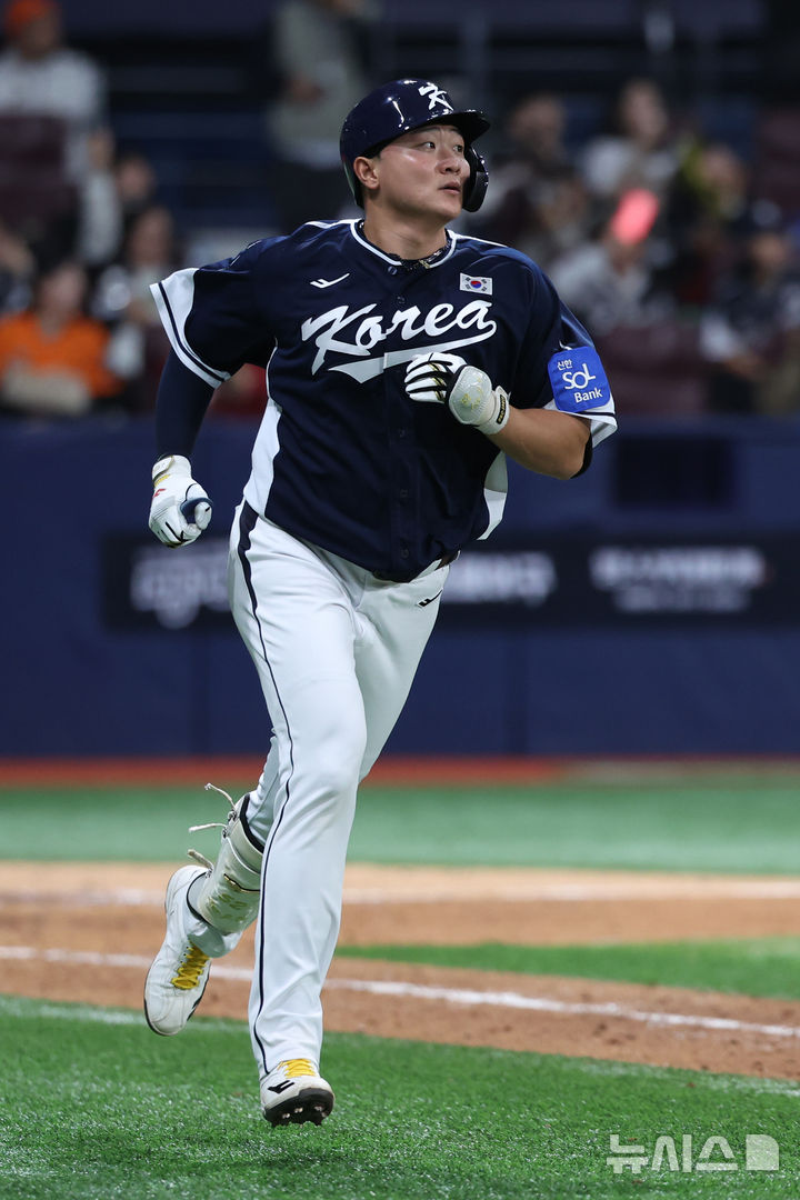 [서울=뉴시스] 조성우 기자 = 9일 오후 서울 구로구 고척스카이돔에서 열린 2025 K-베이스볼 시리즈 대한민국과 체코의 평가전 2차전 경기, 한국 9회초 공격 무사 주자 1루서 이재원이 투런 홈런을 때린 뒤 베이스를 돌고 있다. 2025.11.09. [email protected]
