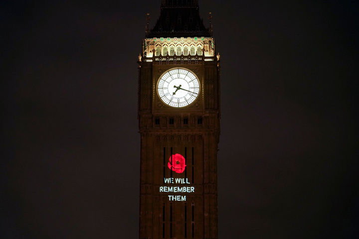 [런던=AP/뉴시스] 9일(현지 시간) 영국 런던에서 현충일을 앞둔 추모 주일을 맞아 엘리자베스 타워(빅벤)에 붉은 양귀비 조명이 비치고 있다. 영국 연방 국가들은 제1차 세계 대전을 비롯한 전쟁을 기념하기 위해 1차 세계 대전이 끝난 1918년 11월 11일을 현충일로 기념한다. 영국은 11월 11일에 가까운 일요일에 추모 행사를 연다. 2025.11.10.