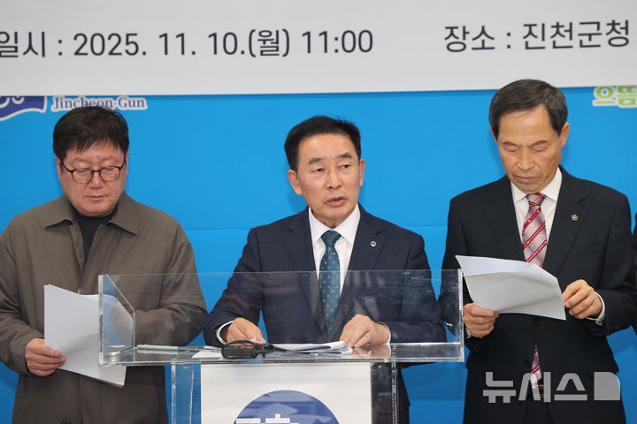 [진천=뉴시스] 송기섭(가운데) 충북 진천군수가 10일 군청 브리핑실에서 '친일반민족행위자 재산 국가귀속 프로젝트' 추진 상황에 대해 설명하고 있다. 군은 자문위원회 심의를 거쳐 확정한 1차 조사분 5필지를 친일재산 의심토지로 보고, 이를 법무부에 조사 의뢰할 방침이다. (사진=진천군 제공) 2025.11.10. [email protected]
