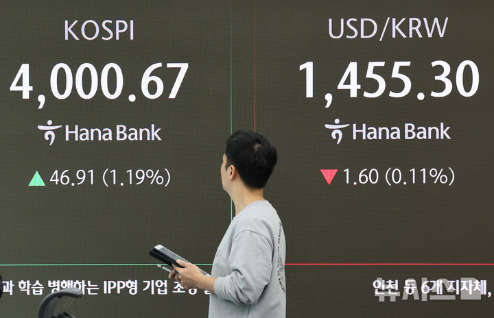 [서울=뉴시스] 배훈식 기자 = 10일 오전 서울 중구 하나은행 딜링룸 전광판에 코스피가 전 거래일보다 46.91 포인트(1.19%) 오른 4000.67 포인트를 나타내며 상승 출발하고 있다. 원달러 환율은 1.60원(0.10%) 내린 1455.30원. 2025.11.10. [email protected]