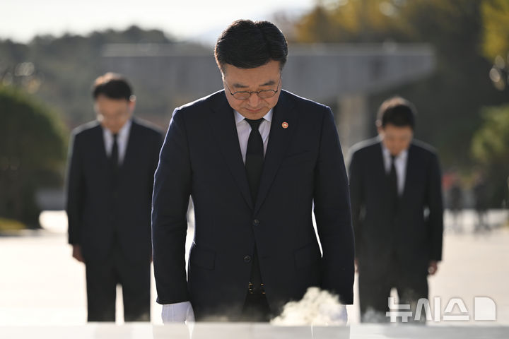 [광주=뉴시스] 이영주 기자 = 윤호중(가운데) 행정안전부 장관이 10일 오전 광주 북구 운정동 국립5·18민주묘지를 찾아 참배하고 있다. 2025.11.10. [email protected]