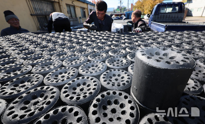 [인천=뉴시스] 전진환 기자 = 10일 오전 인천 서구 가좌동의 한 연탄 배달업체에서 작업자들이 난방용 연탄 배달을 준비하고 있다. 2025.11.10 [email protected]