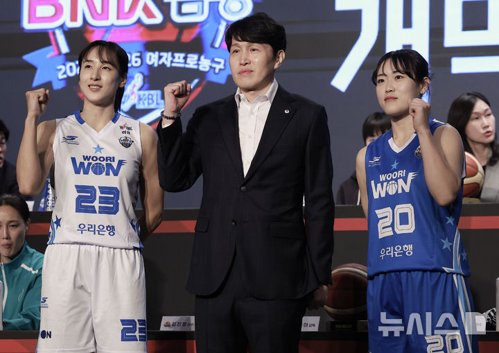 [서울=뉴시스] 정병혁 기자 = 10일 서울 강서구 메이필드호텔에서 열린 BNK 금융 2025-2026 여자프로농구 개막 미디어데이에서 위성우 우리은행 감독과 김단비, 이명관이 포즈를 취하고 있다. 2025.11.10. [email protected]