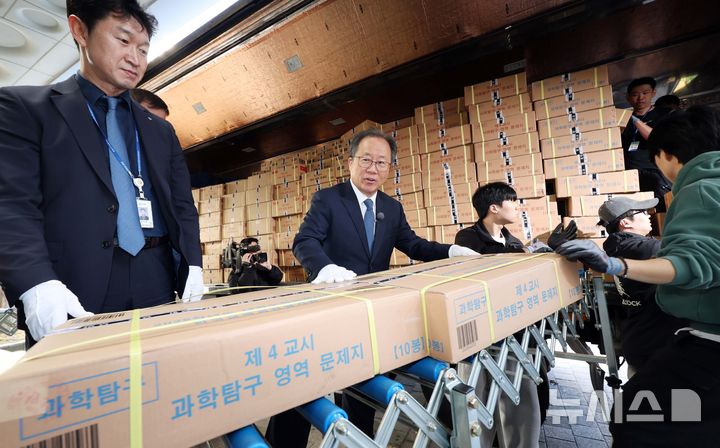 [부산=뉴시스] 하경민 기자 = 2026학년도 대학수학능력시험을 사흘 앞둔 10일 부산 동래구의 한 학교에서 김석준 부산교육감 등이 도착한 수능 문답지를 보관장소로 옮기고 있다.