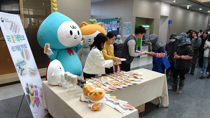 [서울=뉴시스] 농업인의 날과 가래떡데이(11월 11일)을 하루 앞둔 10일 전북 완주군 농촌진흥청 국립식량과학원에서 열린 '가래떡 나눔 행사'에서 곽도연 국립식량과학원장과 직원들이 가래떡을 들어보이고 있다. (사진=농촌진흥청 제공) 2025.11.10. [email protected] *재판매 및 DB 금지