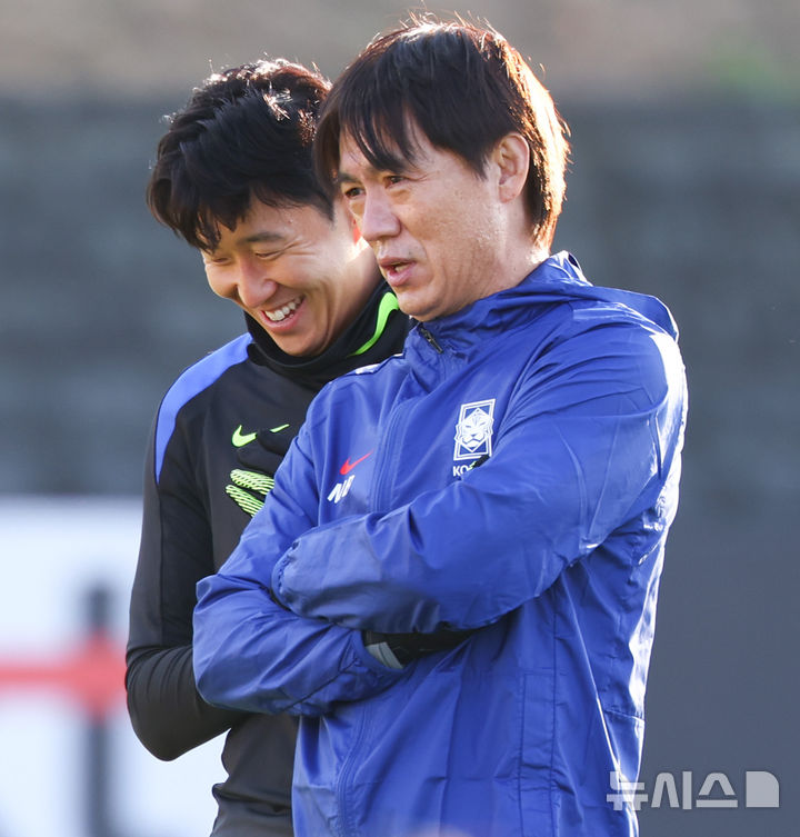 [천안=뉴시스] 황준선 기자 = 홍명보 대한민국 축구 국가대표팀 감독과 주장 손흥민이 10일 오후 충남 천안시 대한민국축구종합센터에서 훈련에 앞서 대화하고 있다.