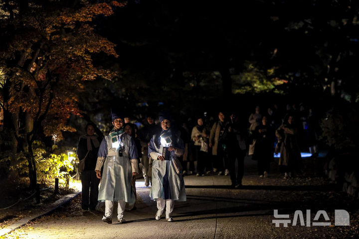 [서울=뉴시스] 정병혁 기자 = 10일 서울 종로구 창경궁에서 열린 2025 야간관람 '동궐동락'을 찾은 관람객들이 몰입형 가이드 투어에 참여해 궁궐을 둘러보고 있다. 2025.11.10. [email protected]