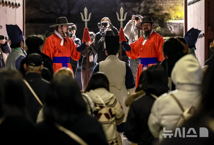 [서울=뉴시스] 정병혁 기자 = 10일 서울 종로구 창경궁에서 열린 2025 야간관람 '동궐동락'을 찾은 관람객들이 몰입형 가이드 투어에 참여해 궁궐을 둘러보고 있다. 2025.11.10. [email protected]