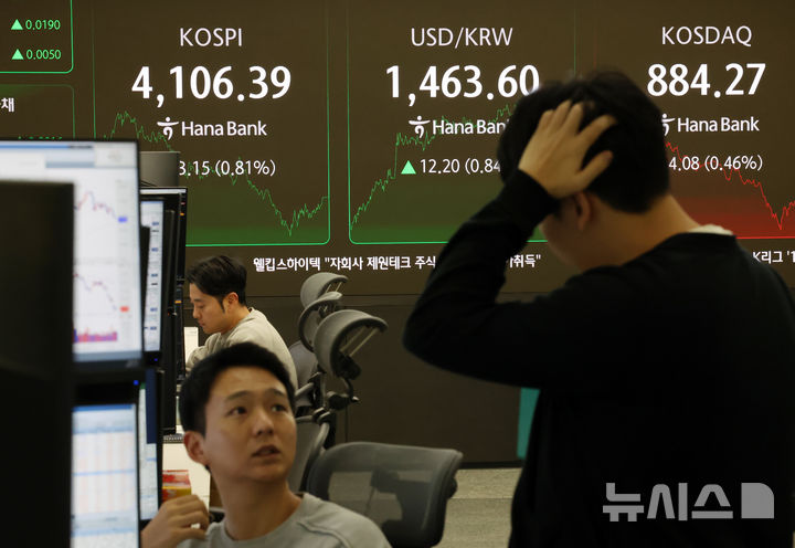 [서울=뉴시스] 조성우 기자 = 코스피가 전 거래일(4073.24)보다 33.15포인트(0.81%) 상승한 4106.39에 장을 마감한 11일 오후 서울 중구 하나은행 딜링룸 전광판에 지수가 표시되고 있다.