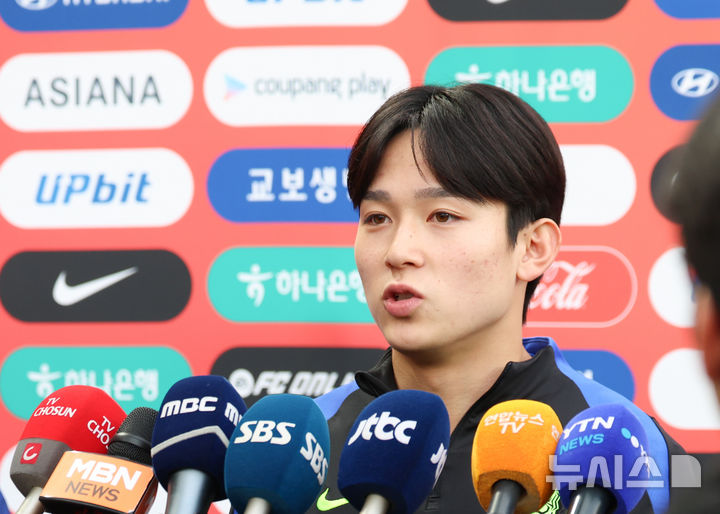 [천안=뉴시스] 이영환 기자 = 대한민국 축구 국가대표팀 양민혁이 11일 오후 충남 천안시 서북구 대한민국 축구종합센터에서 오픈 트레이닝을 앞두고 인터뷰를 하고 있다. 2025.11.11. [email protected]