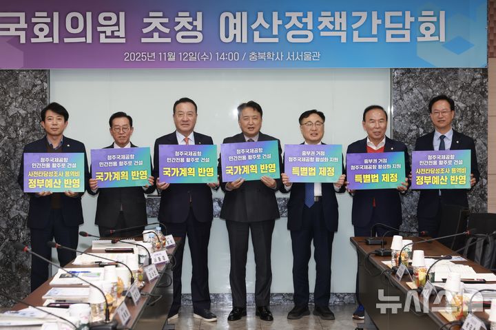 [청주=뉴시스] 김영환(왼쪽 네 번째) 충북도지사를 비롯한 이강일, 이종배, 엄태영, 이광희, 박덕흠, 송재봉 국회의원이 12일 충북학사 서서울관에서 '국회의원 초청 예산정책간담회'를 진행한 뒤 청주국제공항 민간전용 활주로 건설의 국가계획 반영을 요구하며 기념촬영을 하고 있다. (사진=충북도 제공) 2025.11.12. [email protected]