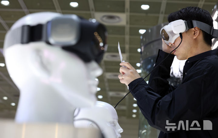 [서울=뉴시스] 이영환 기자 = 12일 오전 서울 강남구 코엑스에서 열린 2025 서울디자인페스티벌 한국타이어와 모델솔루션 협업 부스에서 관람객이 산업용 AR 고글을 살펴보고 있다. 2025.11.12. [email protected]