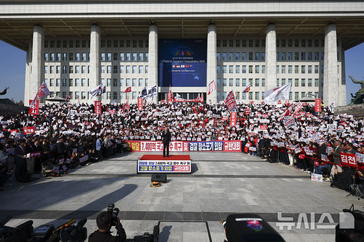[서울=뉴시스] 김근수 기자 = 장동혁 국민의힘 당대표가 12일 서울 여의도 국회의사당 본관 앞 중앙계단에서 열린 대장동 일당 7400억 국고 환수 및 검찰 항소포기 외압 규탄대회에서 발언하고 있다. 2025.11.12. [email protected]