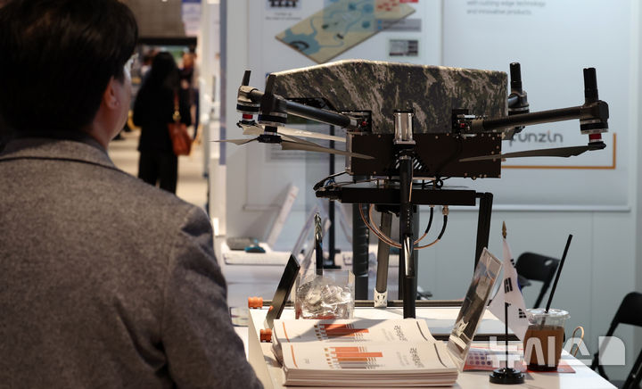 [서울=뉴시스] 이영환 기자 = 12일 오후 서울 강남구 코엑스 더플라츠에서 열린 2025 대한민국전파산업대전에서 인공지능 전자기스펙트럼 정찰 시스템을 탑재한 드론이 전시되어 있다. 2025.11.12. [email protected]