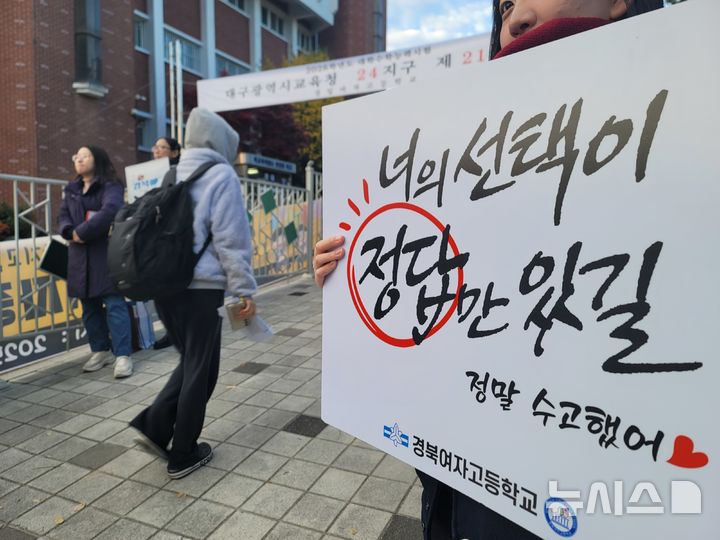 [대구=뉴시스] 이상제 기자 = 2026학년도 대학수학능력시험일인 13일 오전 대구시교육청 24지구 제21시험장이 마련된 경일여자고등학교 앞에서 학생과 선생님들이 수험생을 응원하고 있다. 2025.11.13. [email protected]