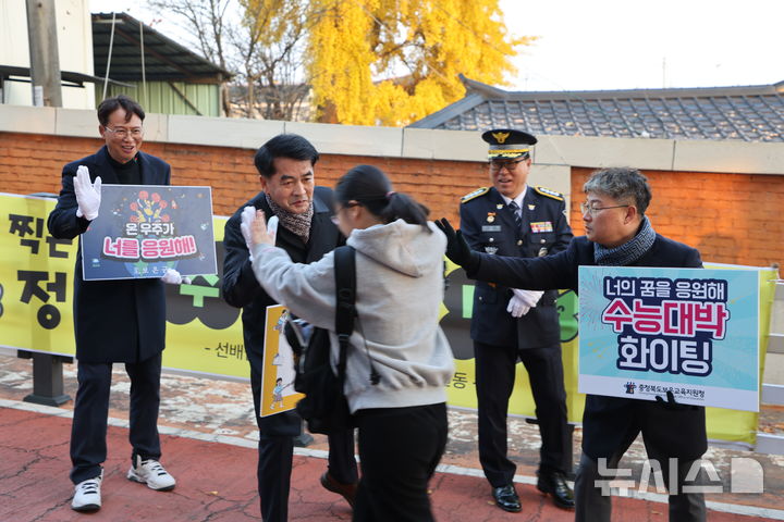 [보은=뉴시스] 13일 2026학년도 대학수학능력시험 충북 59지구 제3시험장이 마련된 보은읍 보은고교 앞에서 최재형 보은군수와 윤대성 보은군의장, 전병일 보은교육장, 노광식 보은경찰서장이 입실하는 수험생을 응원하고 있다. (사진=보은군 제공) 2025.11.13. [email protected]