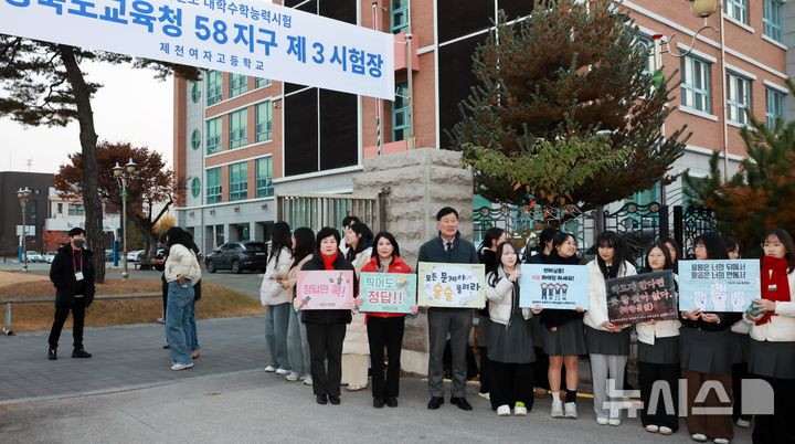 [제천=뉴시스] 이병찬 기자 = 13일 충북 제천여고 수능 시험장 앞에서 박영기 의장 등 제천시의원들이 수험생을 격려하고 있다.(사진=제천시의회 제공)[email protected]