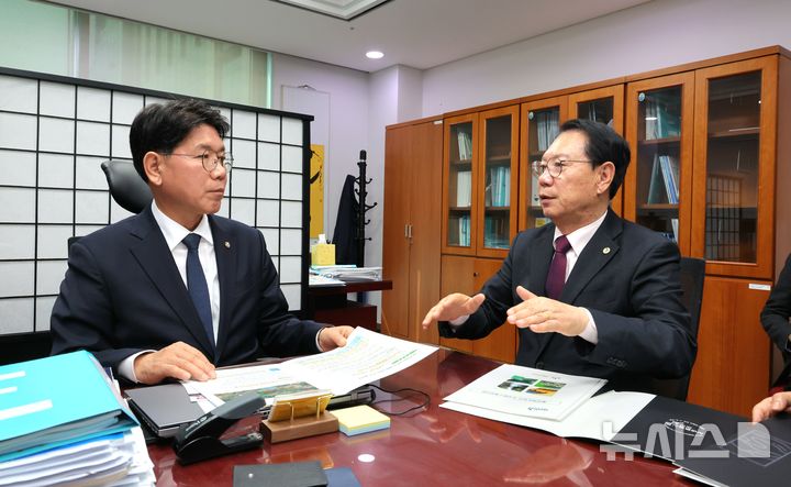 [괴산=뉴시스] 서주영 기자 = 송인헌 충북 괴산군수(오른쪽)가 13일 국회를 찾아 이재관(충남 천안시을) 더불어민주당 국회의원에게 지역 현안사업의 필요성을 설명하고 있다. (사진= 괴산군 제공) 2025.11.13. [email protected]