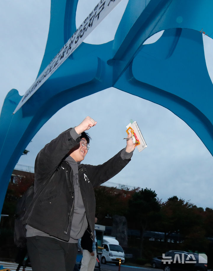 [제주=뉴시스] 우장호 기자 = 2026학년도 대학수학능력시험일인 13일 오전 수험생이 제주도교육청 95지구 제2시험장이 마련된 제주제일고등학교 앞에서 화이팅을 외치고 있다. 2025.11.13. [email protected]