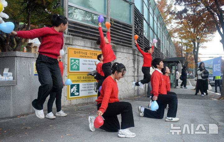 [전주=뉴시스] 김얼 기자 = 2026학년도 대학수학능력시험일인 13일 전북 전주시 전주대학교사범대학부설고등학교에서 한 학교 관계자들이 응원가에 맞춰 춤을 추고 있다. 2025.11.13. [email protected]