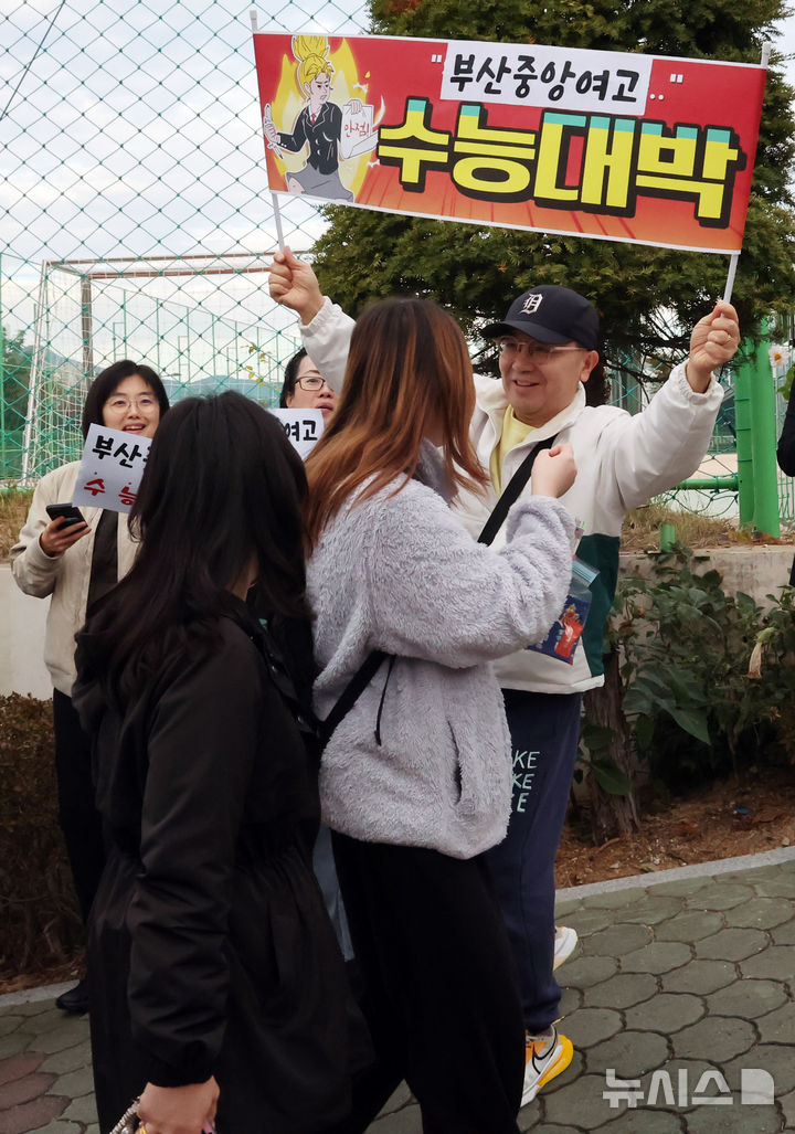 [부산=뉴시스] 하경민 기자 = 2026학년도 대학수학능력시험일인 13일 부산 연제구 연제고등학교 정문 앞에서 교사 등이 고3 수험생들을 응원하고 있다.
