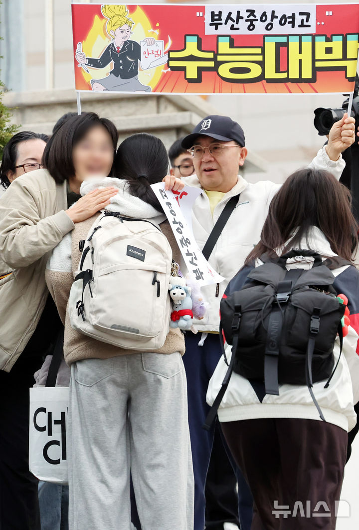 [부산=뉴시스] 하경민 기자 = 2026학년도 대학수학능력시험일인 13일 부산 연제구 연제고등학교 정문 앞에서 교사 등이 고3 수험생들을 응원하고 있다.