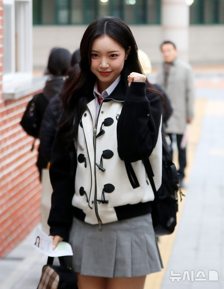 [서울=뉴시스] 김혜진 기자 = 그룹 캔디샵 수이가 13일 오전 서울 송파구 방산고등학교에 마련된 2026학년도 대학수학능력시험 서울특별시교육청 제16시험지구 제10시험장 앞에서 입실 전 포즈를 취하고 있다. 2025.11.13. [email protected]