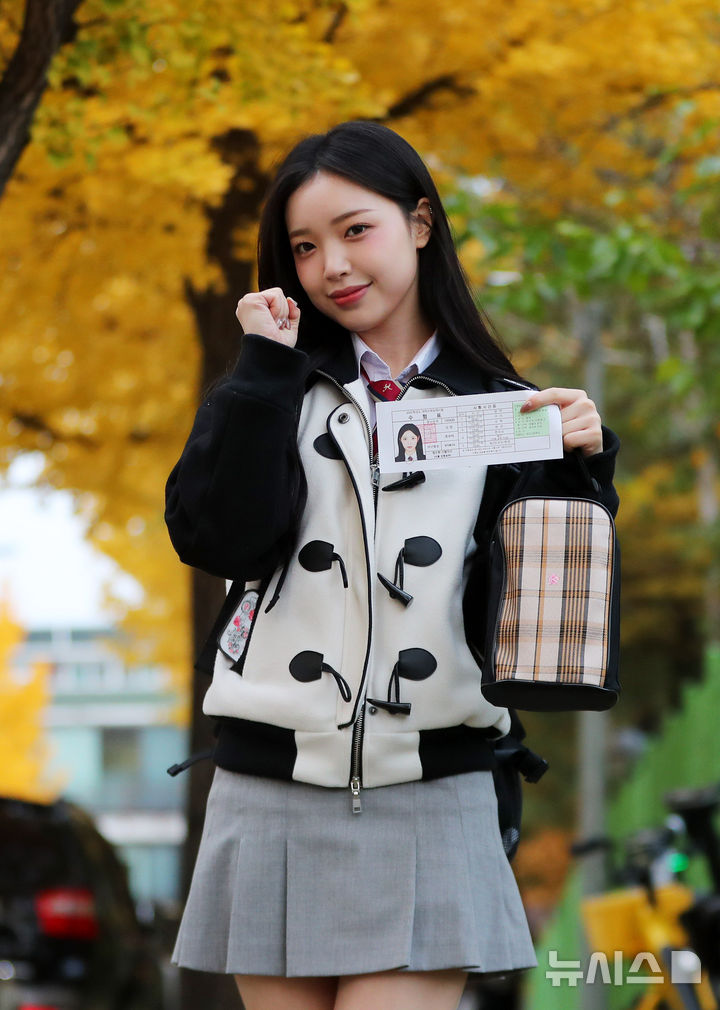 [서울=뉴시스] 김혜진 기자 = 그룹 캔디샵 수이가 13일 오전 서울 송파구 방산고등학교에 마련된 2026학년도 대학수학능력시험 서울특별시교육청 제16시험지구 제10시험장 앞에서 입실 전 포즈를 취하고 있다. 2025.11.13. [email protected]