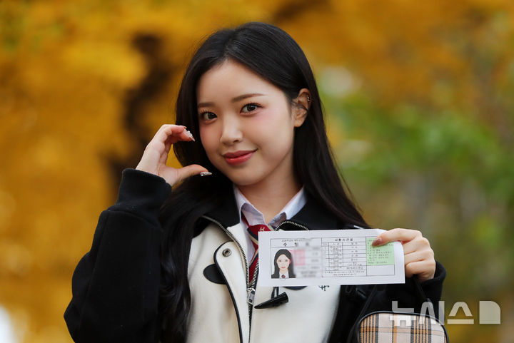 [서울=뉴시스] 김혜진 기자 = 그룹 캔디샵 수이가 13일 오전 서울 송파구 방산고등학교에 마련된 2026학년도 대학수학능력시험 서울특별시교육청 제16시험지구 제10시험장 앞에서 입실 전 포즈를 취하고 있다. 2025.11.13. [email protected]