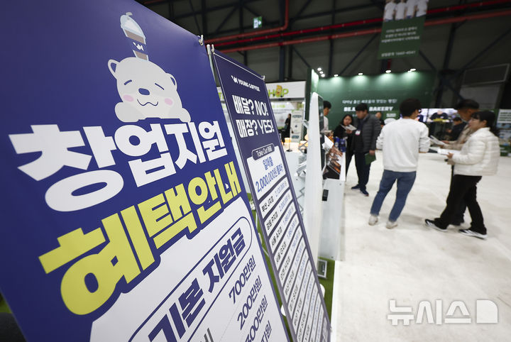 [서울=뉴시스] 김근수 기자 = 13일 서울 강남구 세텍에서 열린 프랜차이즈 박람회 2025에서 한 프랜차이즈 부스에서 관람객들이 상담을 받고 있다. 2025.11.13. [email protected]
