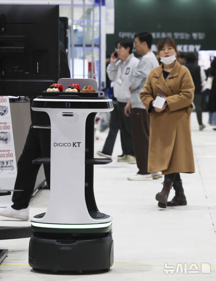 [서울=뉴시스] 김근수 기자 = 13일 서울 강남구 세텍에서 열린 프랜차이즈 박람회 2025에서 한 프랜차이즈 부스 앞에 서빙로봇이 음식을 나르고 있다. 2025.11.13. [email protected]