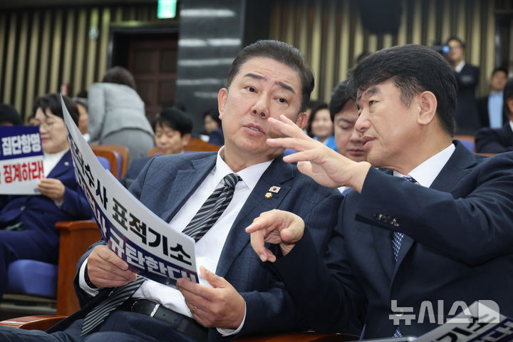 [서울=뉴시스] 김명년 기자 = 김병기 더불어민주당 원내대표가 13일 오전 서울 여의도 국회에서 열린 의원총회에서 문진석 원내운영수석부대표와 대화하고 있다. 2025.11.13. [email protected]