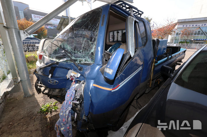 [부천=뉴시스] 조성우 기자 = 13일 경기 부천시 오정구 원종동 제일시장에서 주행 중인 트럭이 상점으로 돌진해 20여 명의 사상자가 발생했다. 사진은 사고 조사를 위해 오정경찰서에 견인된 해당 차량의 모습. 2025.11.13. [email protected]