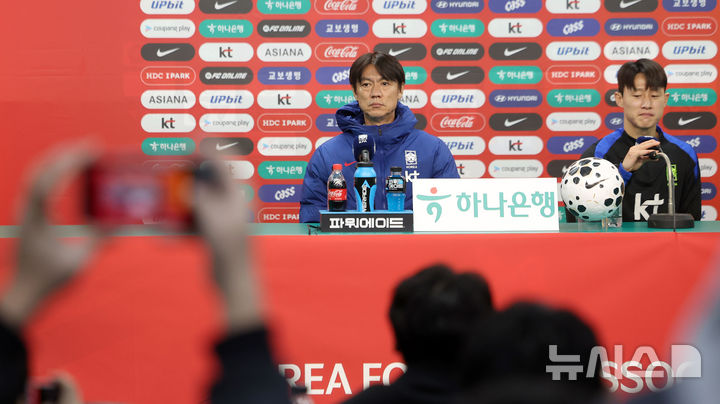 [대전=뉴시스] 김선웅 기자 = 볼리비아와 평가전을 앞둔 대한민국 축구대표팀 홍명보 감독과 이재성이 13일 대전 월드컵경기장에서 기자회견을 하고 있다. 2025.11.13. [email protected]