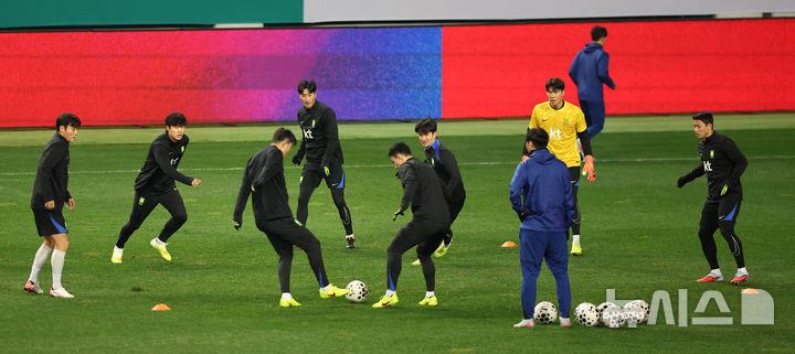 [대전=뉴시스] 김선웅 기자 = 볼리비아와 평가전을 앞둔 대한민국 축구대표팀이 13일 대전 월드컵경기장에서 공식 훈련을 하고 있다. 2025.11.13. [email protected]