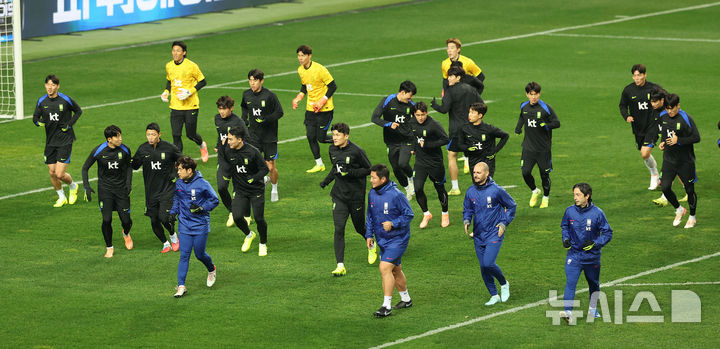 [대전=뉴시스] 김선웅 기자 = 볼리비아와 평가전을 앞둔 대한민국 축구대표팀이 13일 대전 월드컵경기장에서 공식 훈련을 하고 있다. 2025.11.13. [email protected]