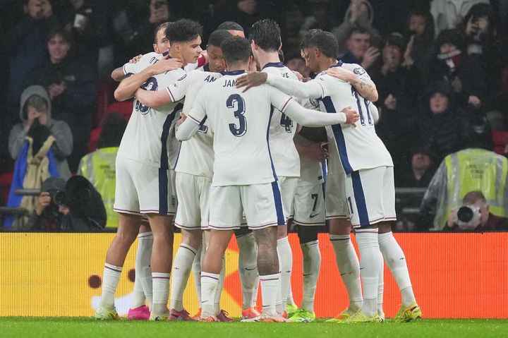 [런던=AP/뉴시스] 잉글랜드 선수들이 13일(현지 시간) 영국 런던에서 열린 2026 국제축구연맹(FIFA) 북중미월드컵 유럽 예선 K조 7차전 세르비아와 경기 전반 28분 부카요 사카의 선제골에 환호하고 있다. 잉글랜드가 2-0으로 승리하고 7전 전승을 기록했다. 2025.11.14.