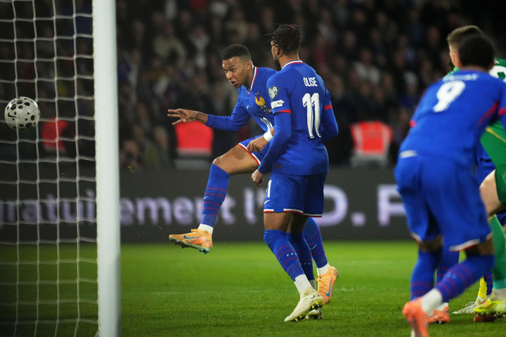 [파리=AP/뉴시스] 프랑스의 킬리안 음바페가 13일(현지 시간) 프랑스 파리에서 열린 2026 국제축구연맹(FIFA) 북중미월드컵 유럽 예선 D조 5차전 우크라이나와 경기 후반 38분 팀 세 번째 골을 넣고 있다. 음바페가 멀티 골로 통산 400골을 기록한 프랑스는 우크라이나를 4-0으로 완파하고 본선 진출을 확정했다. 2025.11.14.