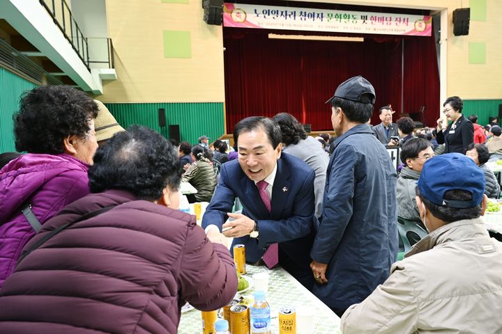 [창녕=뉴시스] 성낙인 경남 창녕군수가 13일 군민체육관에서 열린 노인일자리 참여자 문화 활동 한마당잔치에 참석해 지역 어르신들과 인사를 나누고 있다. (사진= 창녕군 제공) 2025.11.14. [email protected]
