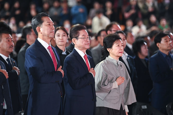[구미=뉴시스] 박홍식 기자 = 박근혜 전 대통령이 14일 경북 구미복합스포츠센터에서 열린 박정희 대통령 탄신 108돌 기념식에서 이철우 경북도지사, 김장호 구미시장과 함께 국민의례를 하고 있다. (사진=구미시 제공) 2025.11.14 [email protected]