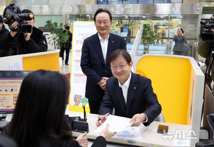 [서울=뉴시스] 김선웅 기자 = 이찬진 금융감독원장이 14일 서울 여의도 KB국민은행 여의도영업부를 방문해 보이스피싱 피해 예방을 위한 오픈뱅킹 안심차단서비스에 가입하며 현장을 점검하고 있다. 왼쪽은 이환주 KB국민은행장. 2025.11.14. [email protected]