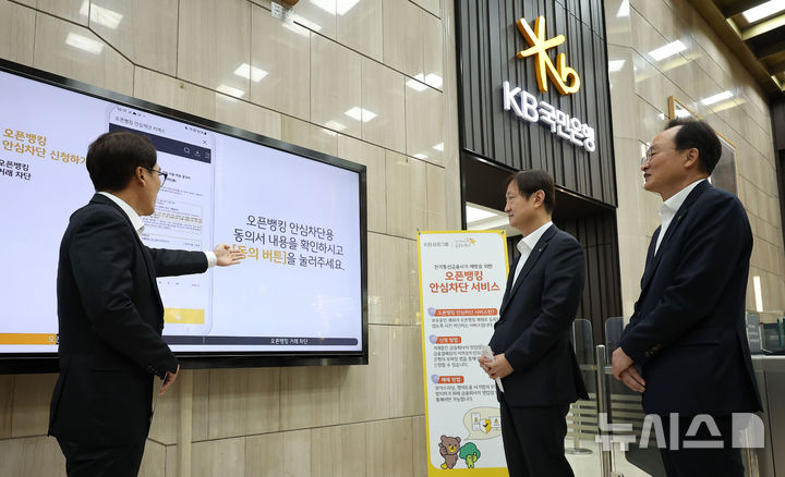 [서울=뉴시스] 김선웅 기자 = 이찬진 금융감독원장이 14일 서울 여의도 KB국민은행 여의도영업부를 방문해 보이스피싱 피해 예방을 위한 오픈뱅킹 안심차단서비스 가입 절차에 대한 설명을 듣고 있다. 오른쪽은 이환주 KB국민은행장. 2025.11.14. [email protected]